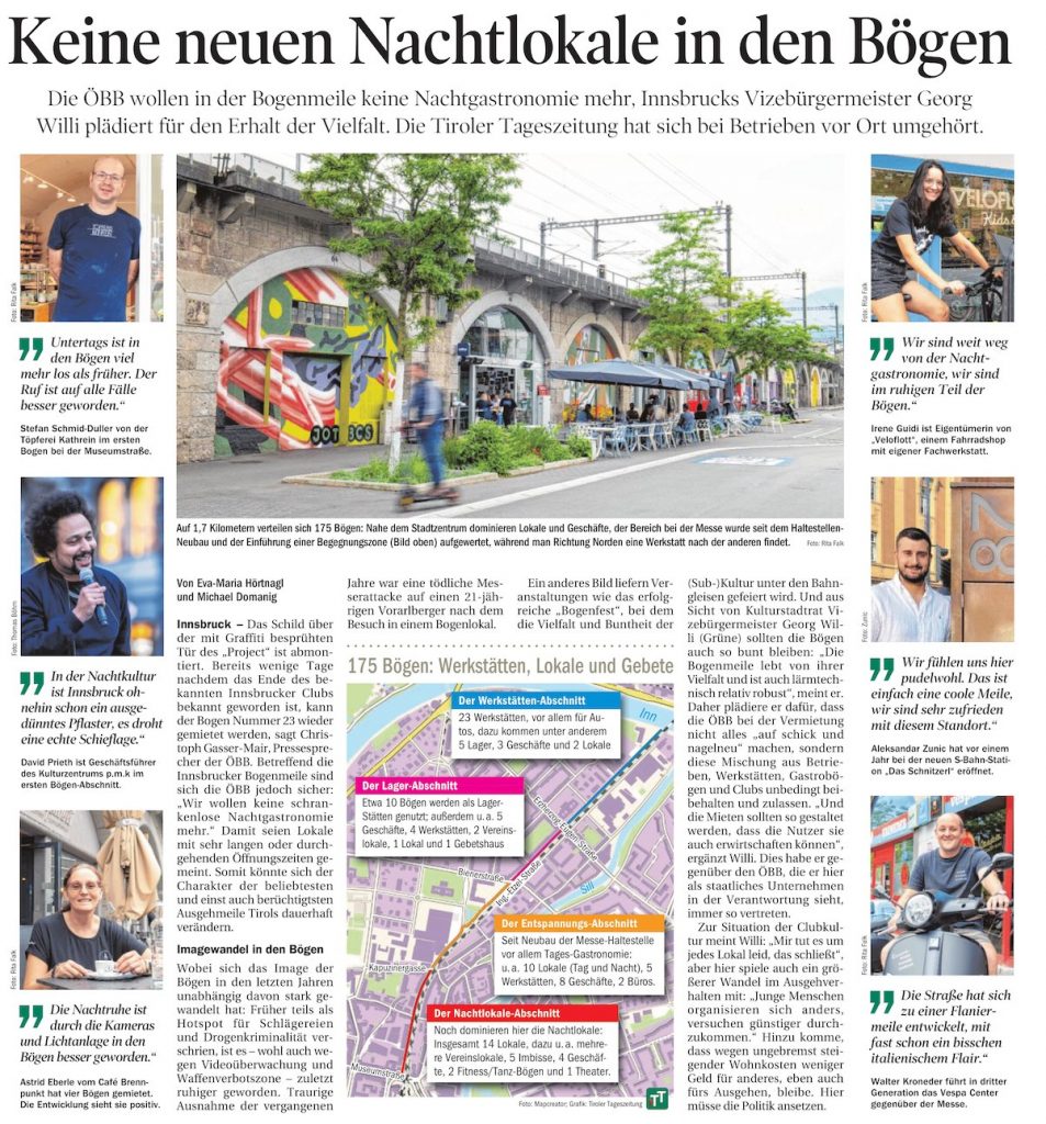 Es gibt meines Wissens nach in ganz Innsbruck auch kein einziges Lokal mehr, das durchgehend geöffnet hätte – und wenn, dann maximal an irgendeiner Tankstelle. Auch gibt es in den Bögen mittlerweile nur noch wenige Lokale mit sehr langen Öffnungszeiten. Es gibt ein paar verbleibende mit späten Öffnungszeiten, aber die sperren dafür auch erst nachts auf.