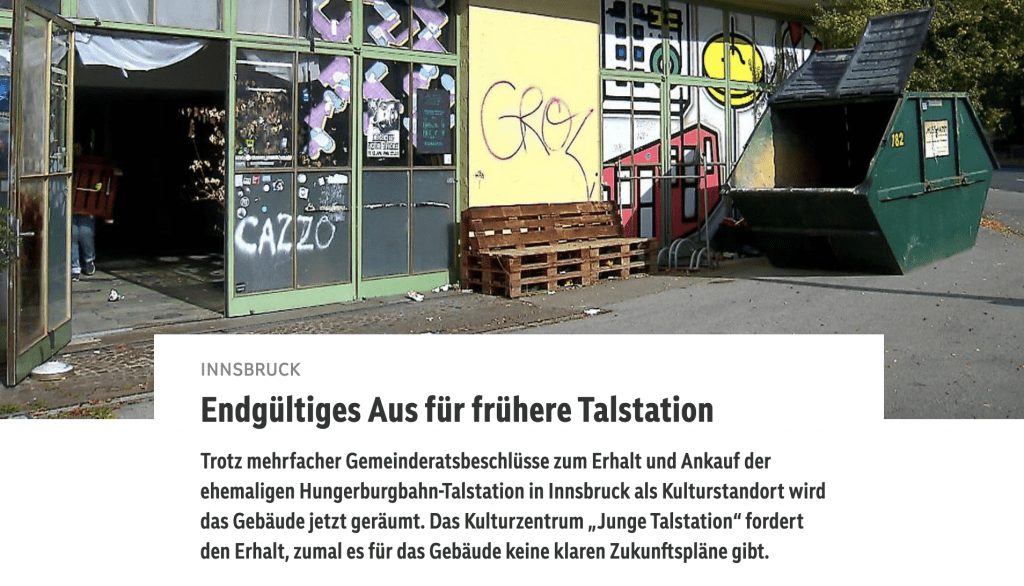 Dass die Talstation in Innsbruck jetzt leer steht, ist eine Schande für die ganze Stadt. Dem bis vor Kurzem dort angesiedelten Kulturverein, der dazu beigetragen hat, das Gebäude und die Gegend insgesamt zu beleben, gebührt hingegen mein größter Respekt für die langjährige Arbeit und die Ausdauer im Bestreben, diesen Ort als lebendige Plattform zu erhalten. Danke für euer Herzblut, euren Schweiß und die vielen Stunden, die ihr dort investiert habt. Danke für die Proberäume, Ausstellungen, Konzerte und Begegnungsmöglichkeiten für viele junge Menschen in Innsbruck, die sich mittlerweile nicht mehr wirklich gehört fühlen und vielerorts unerwünscht sind.